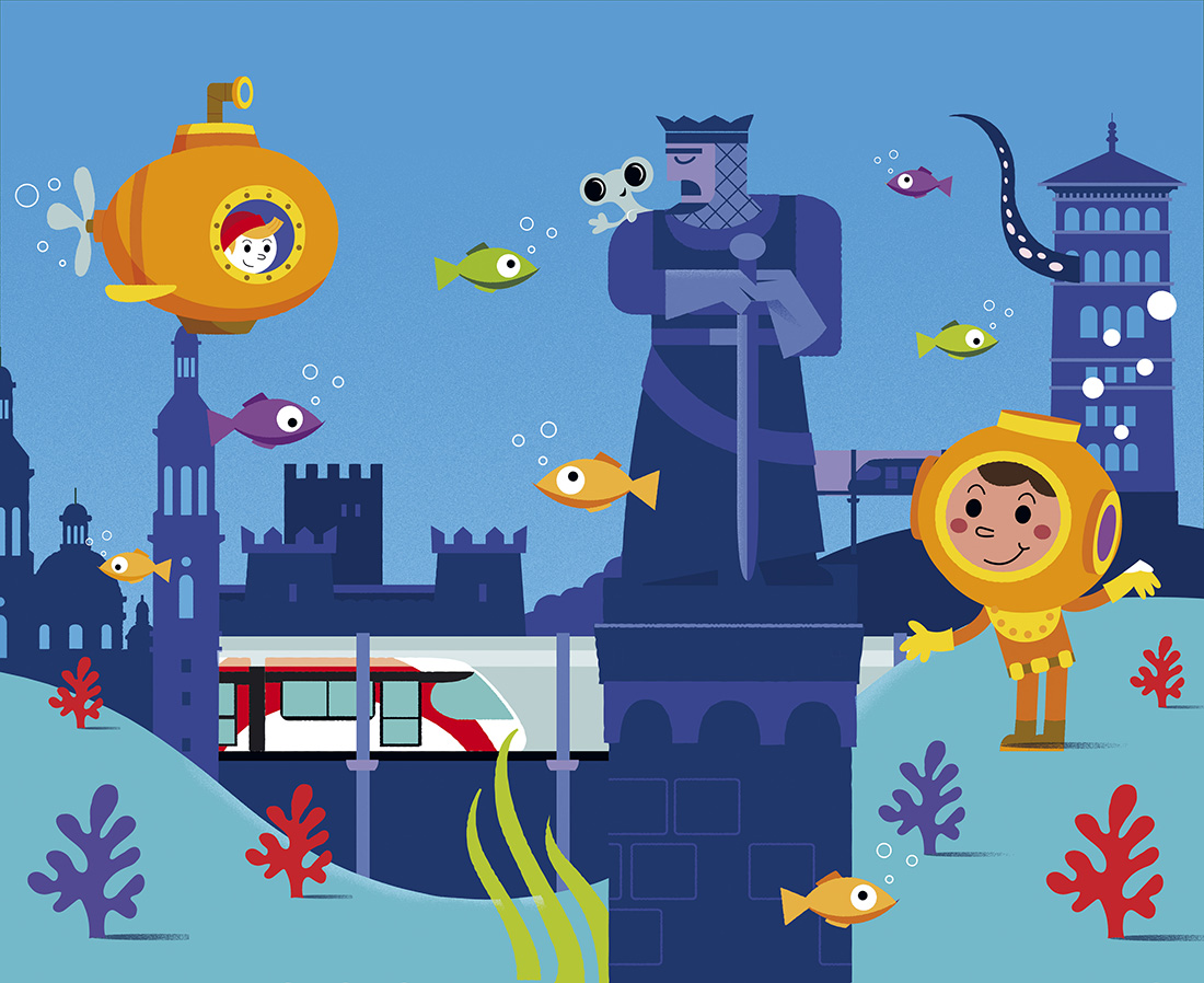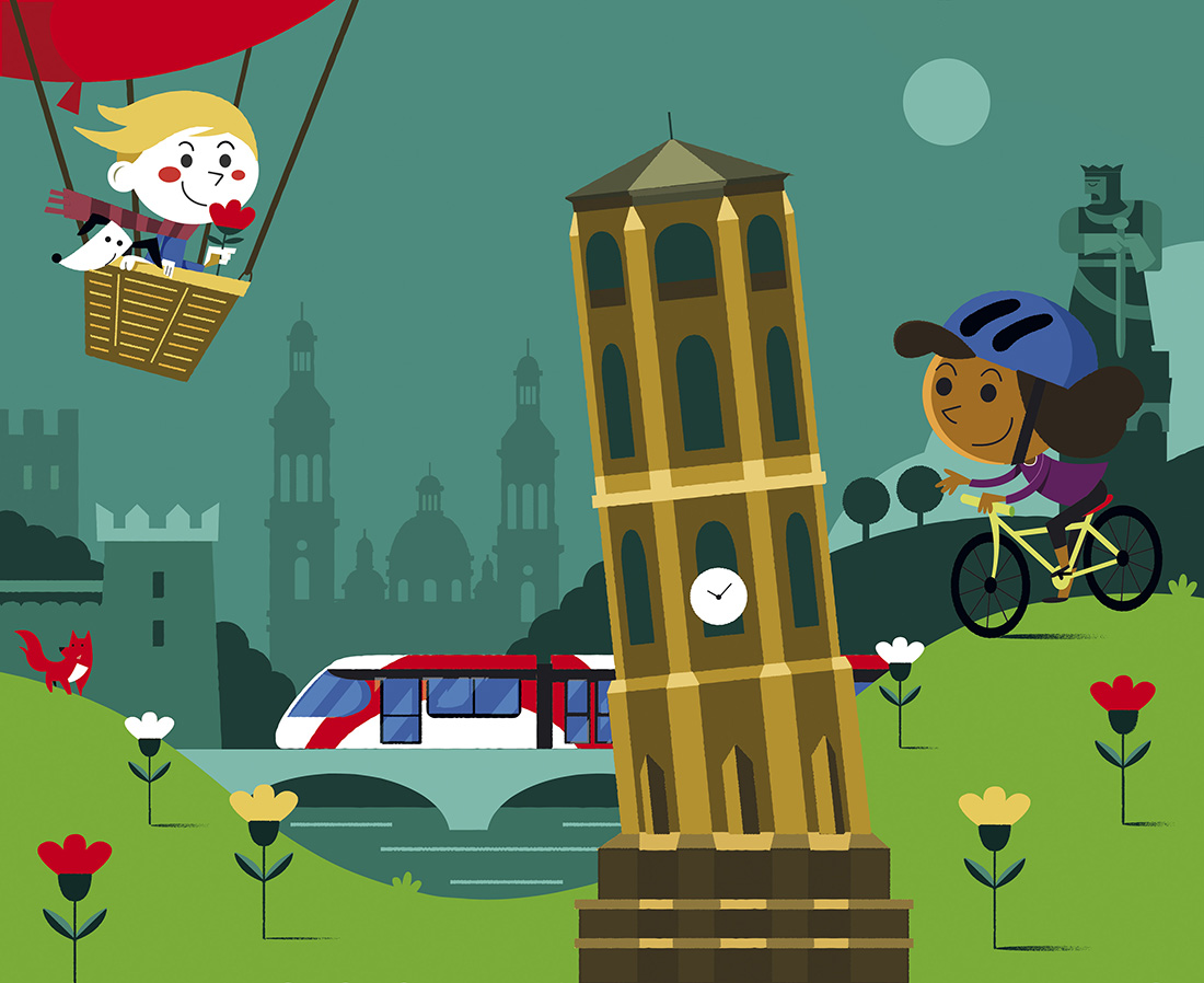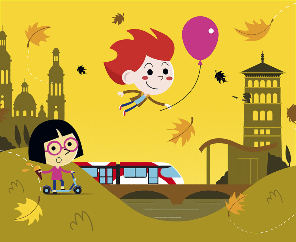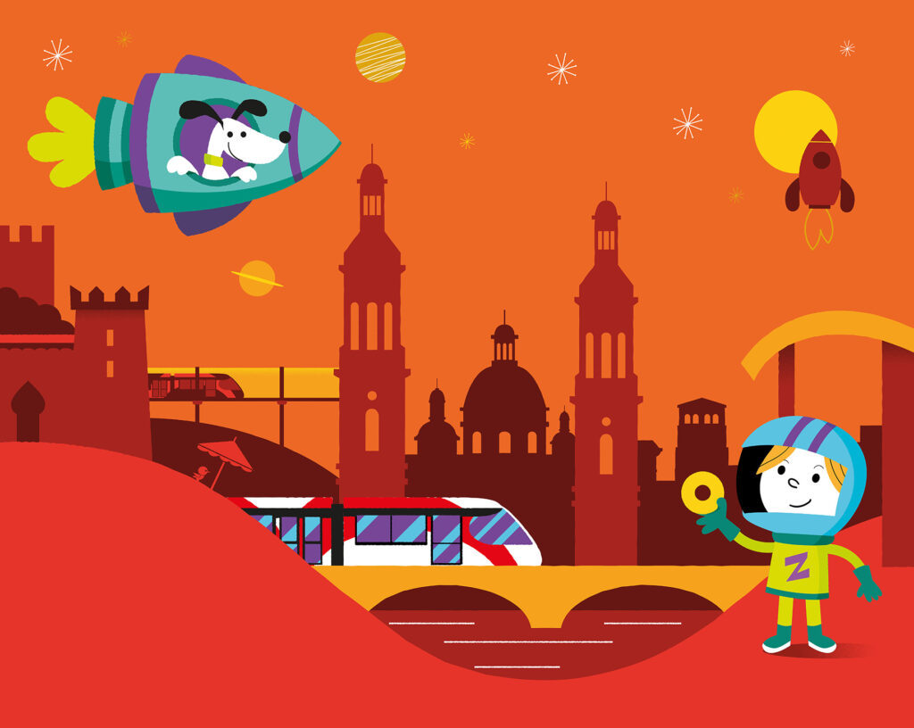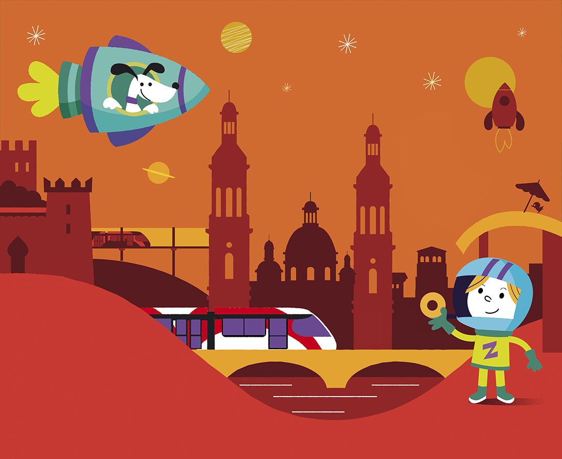 David Maynar opta por una explosión de color para cuatro futuros imaginarios de la ciudad de Zaragoza. Cuatro elementos: agua, tierra, fuego y aire. Cuatro gamas cromáticas: azul,  verde, rojo y amarillo. Cuatro trípticos retro iluminados que dialogan entre las marquesinas de la Avenida Fernando el Católico inundando la ciudad con una sonrisa de luz y color.